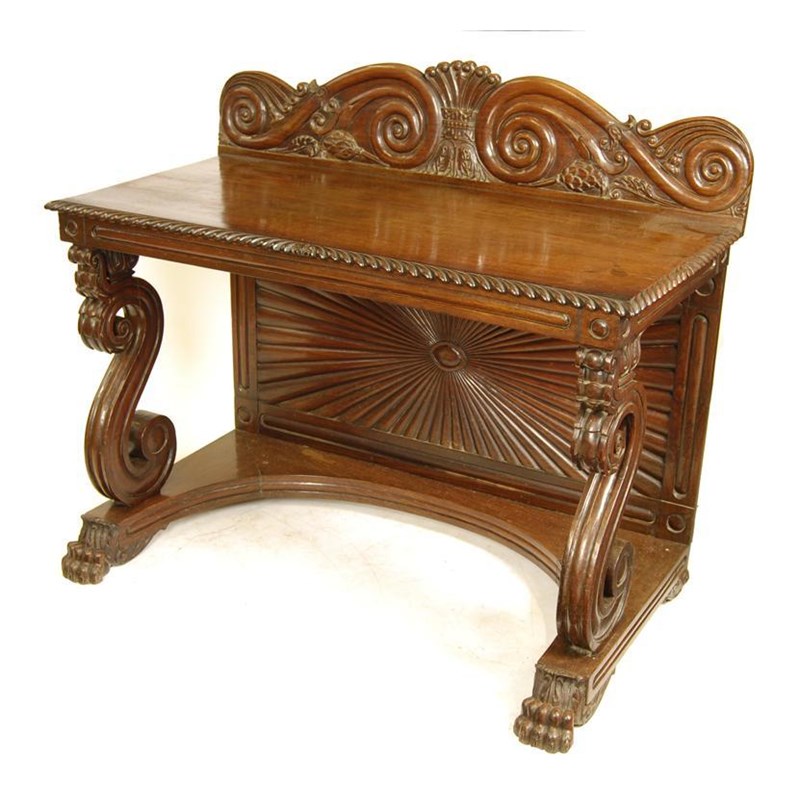A mid 19th century Anglo-Indian carved rosewood console table, with a raised back and a leaf and gadroon edge, on 'S' scroll supports and a concave base with a radiating fluted back panel, on paw feet, 39.75in (101cm) h, 47.25in (120cm) w, 25.5in (65cm) d.