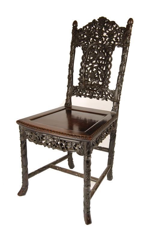 A Chinese carved hardwood side chair, with pierced decoration, the splat with a Dog of Fo and a Phoenix, to a panelled seat.