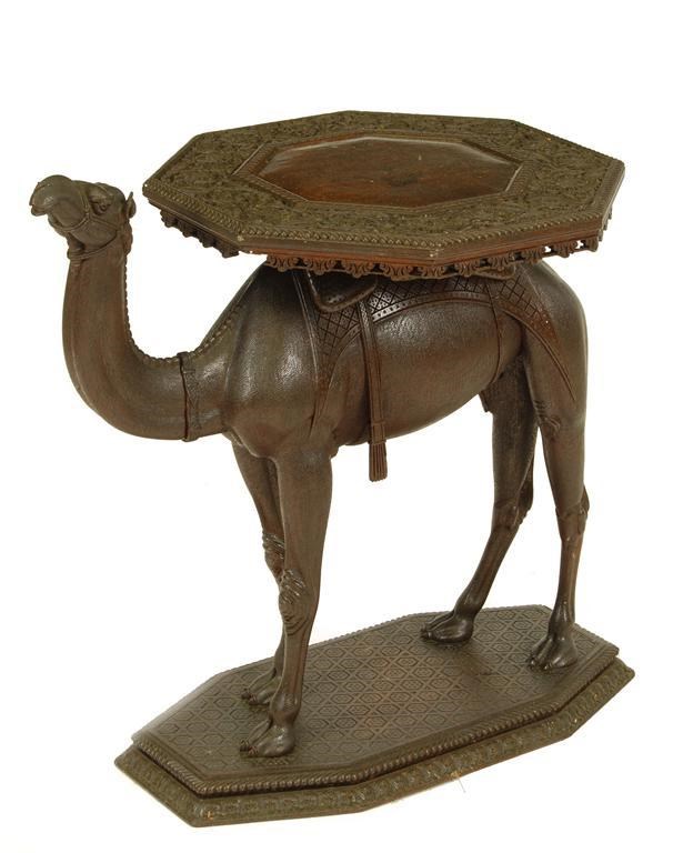 An Anglo-Indian carved hardwood occasional table in the form of a camel, the octagonal top with a band of flowers and foliage, early 20th century, 28.25in (72cm) h, 29in (73.5cm) w, 19.25in (49cm) d. Neck joint slightly loose.