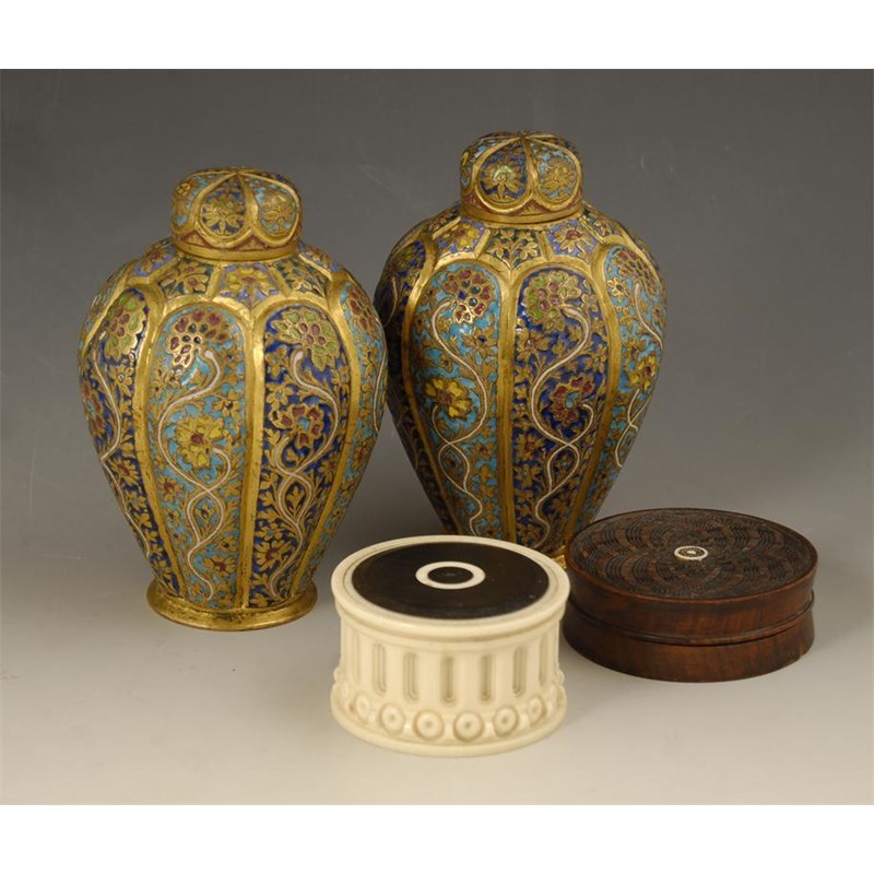 A 19th century ornamentally turned ivory circular box, with a screw-off cover inset ebony, chips and cracks, 2.75in (7cm) dia, a turned rosewood box and cover, and a pair of Indian gilt copper and cloisonne ovoid vases with covers, 6in (15cm) h. (4)