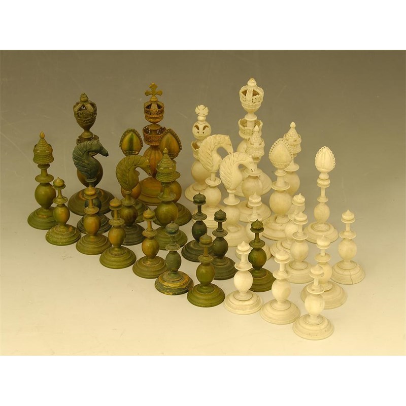 An Indian turned and carved ivory chess set, natural and green stained, the white king 4.25in (10.8cm) h, the pawns 2.25in (5.6cm) h, 19th century. Damages and replacements. (33)