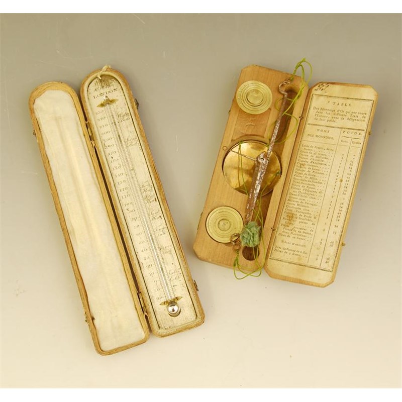 A 19th century silvered brass thermometer, inscribed 'M WOLLER LONDON', the scale marked minus 20 - 230, 8.25in (21cm) l, in a fitted red leather case, and a pair of French steel and brass hand held scales in a fitted wood case with weights and a printed table. (2)