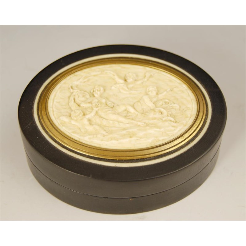 A late 19th century oval ebony snuff box, with an inset carved ivory panel depicting Venus in a dolphin drawn sea chariot, 3.25in (8.3cm) w.