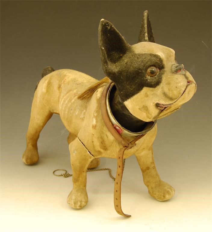 A French model of a Boston Terrier, with a nodding head with and articulated jaw activated by chain in neck, the feet on wooden roller castors, 15in (38cm) h, 17.5in (44.5cm) l.