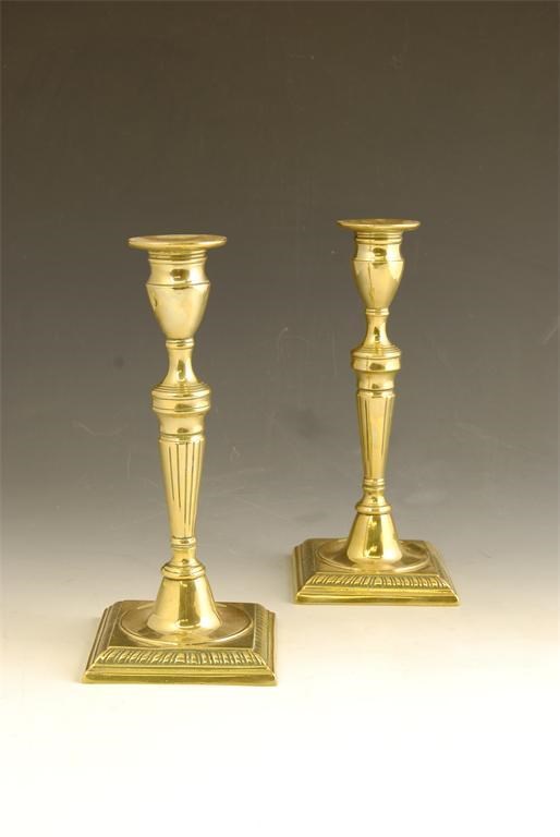 A pair of George III brass candlesticks, each with a square base, tapering stem and an urn shape holder, 10in (25.5cm) h. (2) Worn.