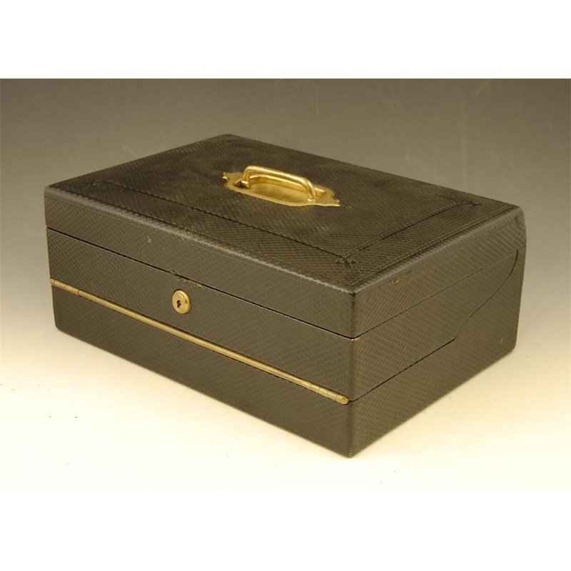A Victorian green leather writing slope, with a sunken brass handle to the hinged cover with a pocket enclosing a blotting pad to a further hinged cover with inset ceramic panels with stationary pocket and lift-out pen and ink tray with three boxes for light and ink having brass plaques inscribed 'Combs Patent 327. REGTD 4TH DECR 1844', with a brass lock stamped Bramah London forced, 6in (15.2cm) h, 14.5in (37cm) w, 10.75in (27.3cm) d.
