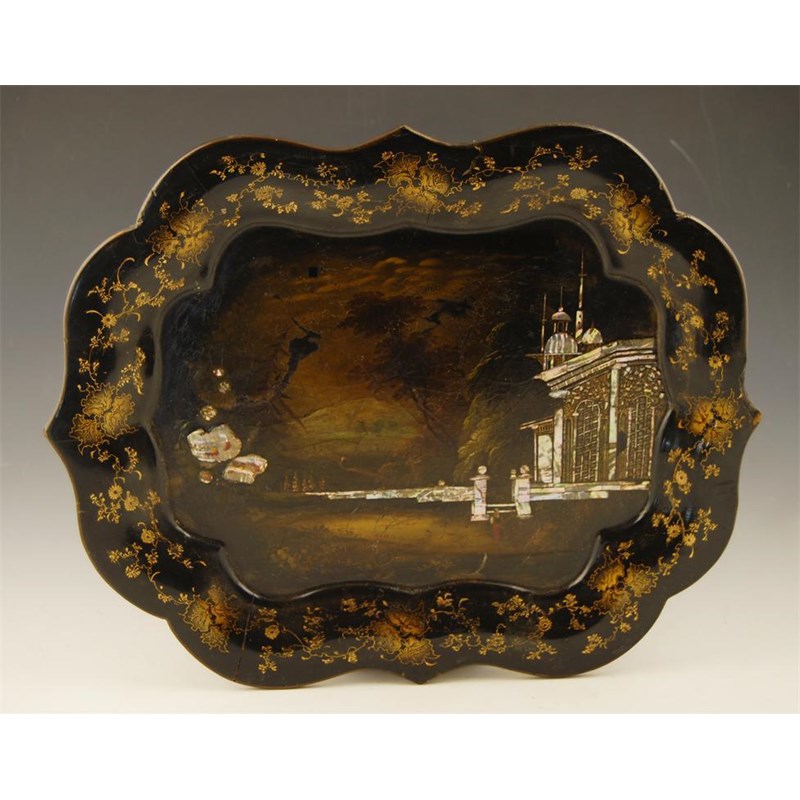 A 19th century papier-mache tray, the centre with a mother of pearl inlaid summer palace and painted landscape, 13.75in x 16.75in (35cm x 42.5cm). Splits and chips.