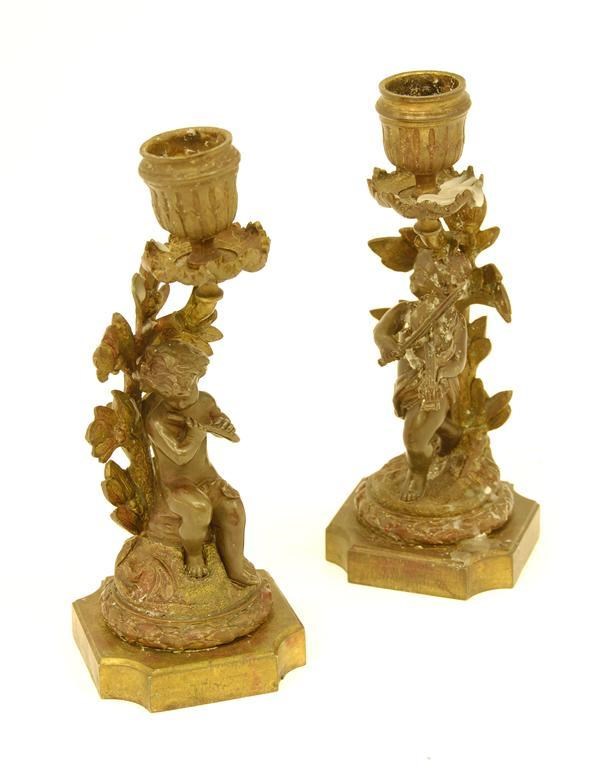A pair of 19th century French bronze candlesticks, modelled as musical amorini, 7in (18cm) h. (2)