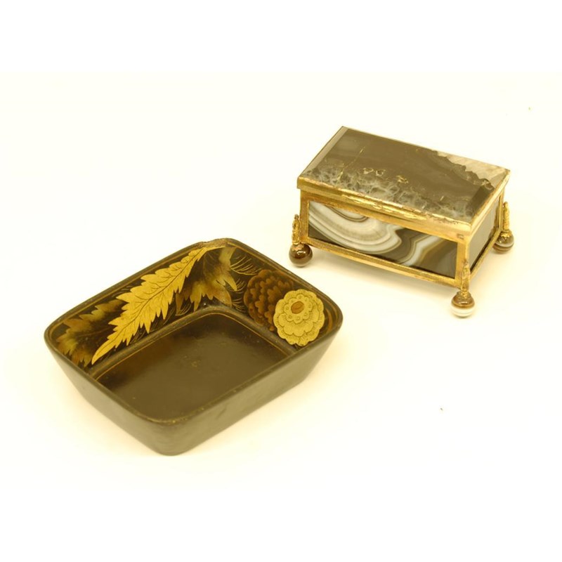 A 19th century onyx gilt copper mounted box, the hinged cover on turned feet, 1.75in (4.5cm) h, and a 19th century papier-mache counter tray. (2)
