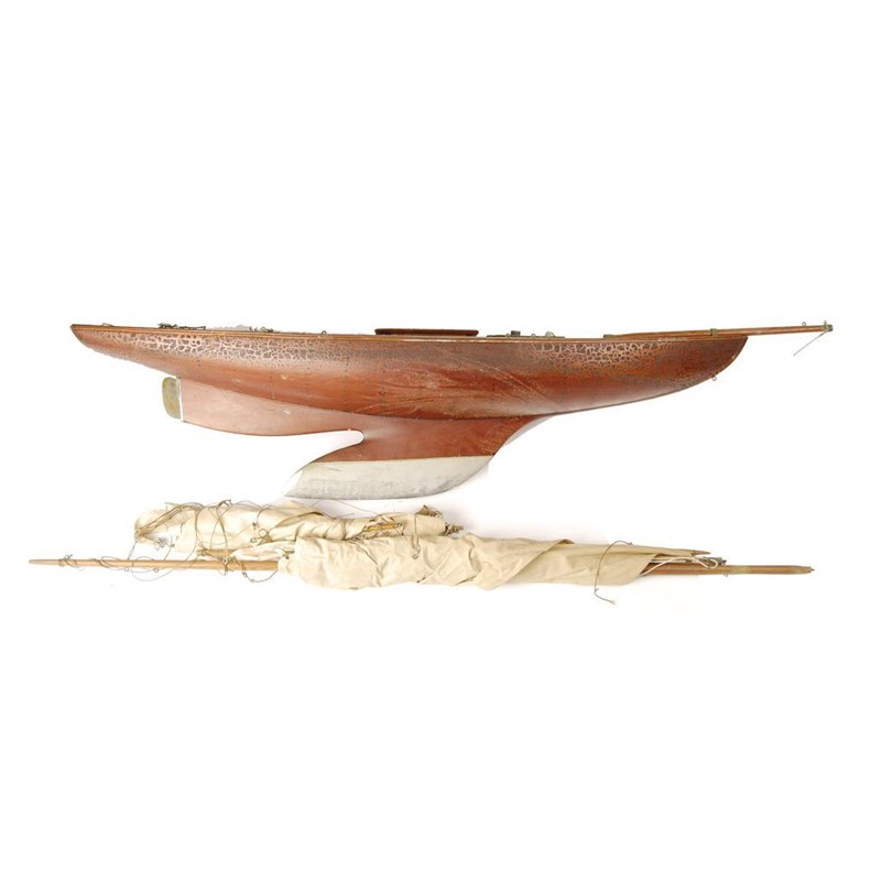 A 1920's mahogany plank on frame racing pond yacht, with a lead keel and brass rudder, with sails, 44.75in (113.5cm) l. Varnish shrinkage.