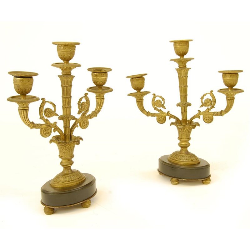 A pair of 19th century ormolu three light candelabra, each on an oval ebonised brass base, with filled hole to the sides, on four turned feet, 10.75in (27.5cm) h, 9in (23cm) w. Old damage and repairs. (2)