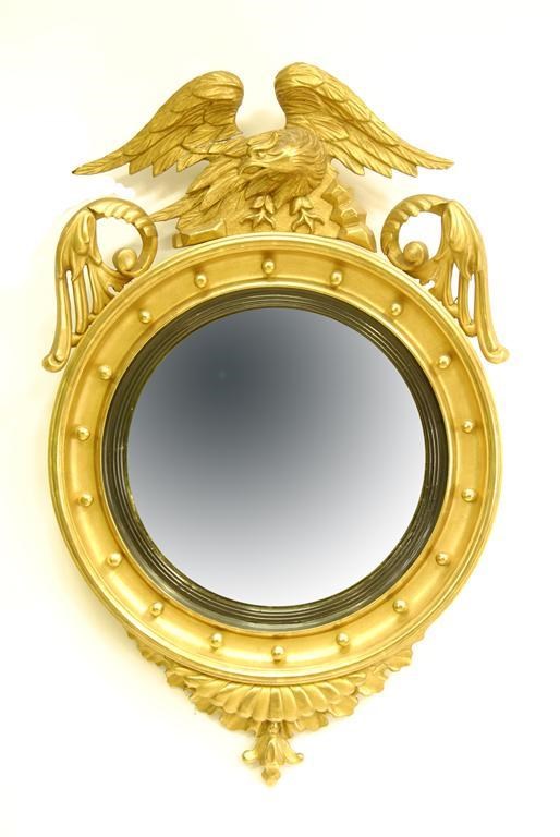A 19th century giltwood and gesso convex mirror, the eagle surmount and leafage scrolls to a conforming base, 42 x 26.25in (107 x 66.5cm).