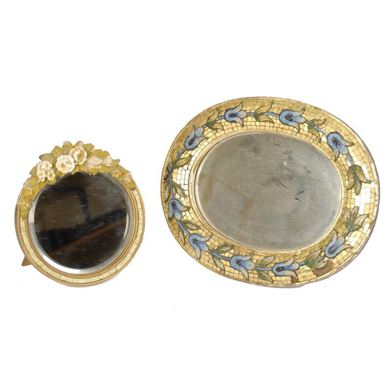 An Italian oval easel back mirror, with a floral mosaic and gilt ground border, 9.75 x 12.25in (25 x 31cm) and a circular Barbola frame mirror. (2)