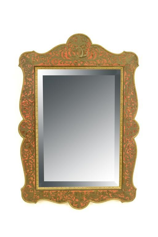 A late 19th century French buhl wall mirror, the rectangular bevelled plate to a shaped tortoiseshell and cut brass frame and a beaded edge, 25 x 16.75in (63.5 x 42cm).