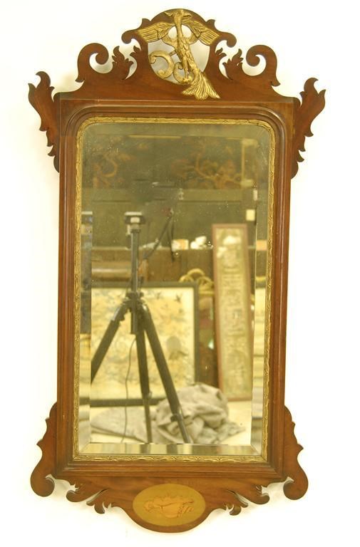A late 19th century mahogany fret frame, parcel gilt and marquetry wall mirror, the bevelled plate with rounded top corners, 36in x 20in (91.5cm x 51cm) and a 19th century mahogany fret frame mirror, losses and replacements. (2)