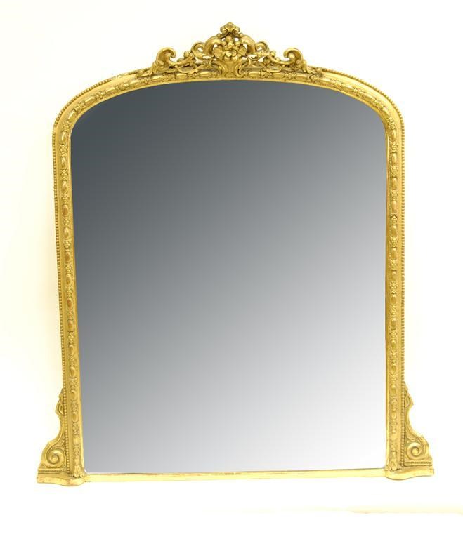 A Victorian gilt and gesso overmantel mirror, the bevelled arch plate to a pierced and carved surmount, 52.5 x 133.5in (47 x 119.5cm).