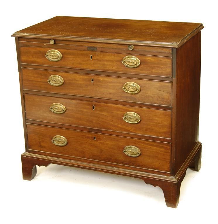 A George III mahogany chest, the rectangular top with an applied moulded edge above a baize lined brushing slide and four graduated drawers, on shaped bracket feet, 33.75in (85.6cm) h, 35.75in (90.3cm) w, 19.5in (49.5cm) d. Handles replaced.