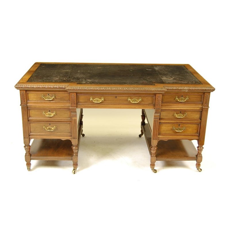 A late Victorian walnut twin pedestal desk by Maple & Co., the breakfront top inset gilt tooled leather to a leaf carved edge, the central drawer stamped 'Maple & Co.', flanked by three drawers to each pedestal with pierced brass handles and fitted Hobbs & Co, London brass locks, one missing, the open platform bases to brass castors, 30.5in (77.5cm) h, 60in (152.5cm) w, 34in (86.5cm) d. The underside of one drawer with an Army & Navy Depositary label inscribed 'Foulston 25/10/99'.