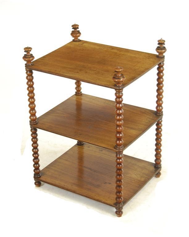 A mahogany three tier whatnot, with bobbin turned supports, 24.75in (62.8cm) h, 17.5in (44.3cm) w, 14.75in (37.5cm) d.