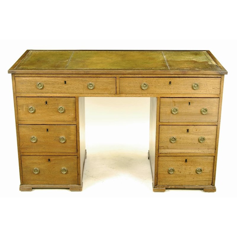A mahogany twin pedestal desk, the reeded edge top inset gilt tooled leather above two frieze drawers, one stamped 'F' and three drawers to each pedestal, 30in (76.2cm) h, 47.5in (120.7cm) w, 20.25in (51.5cm) d. Cracks to sides.