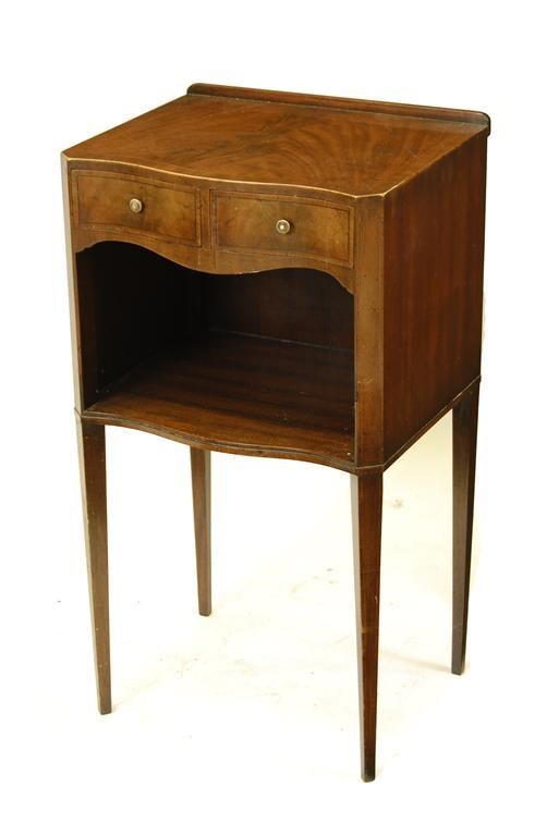 A mahogany serpentine front bedside table, inlaid stringing and with two frieze drawers, the underside with an ivorene plaque for 'AMOS REYNOLDS', 29.25in (74.4cm) h, 16in (40.5cm) w, 13.25in (33.6cm) d.