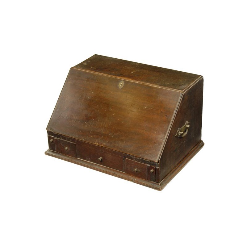 A mahogany table top bureau, with a tiered interior of pigeon holes and two drawers and a well with sliding cover, the frieze with two drawers, and brass side carrying handles, 19th century, 14in (35.5cm) h, 23.75in (60.5cm) w, 16.5in (42cm) d.