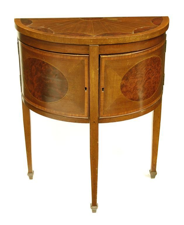 A mahogany and inlaid demi-lune side cabinet in George III style, with amboyna panels to the top and cupboard doors, early 20th century, 29.75in (75.5cm) h, 24.5in (62.3cm) w, 12in (30.3cm) d.
