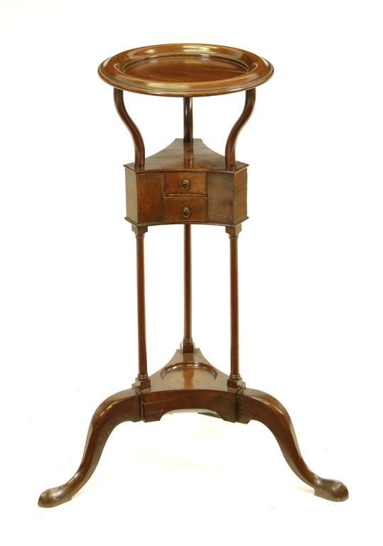 A mahogany basin stand, fitted with two drawers and on tripod supports, 31.25in (79.3cm) h, 22.5in (57cm) w. Damages and replacements.