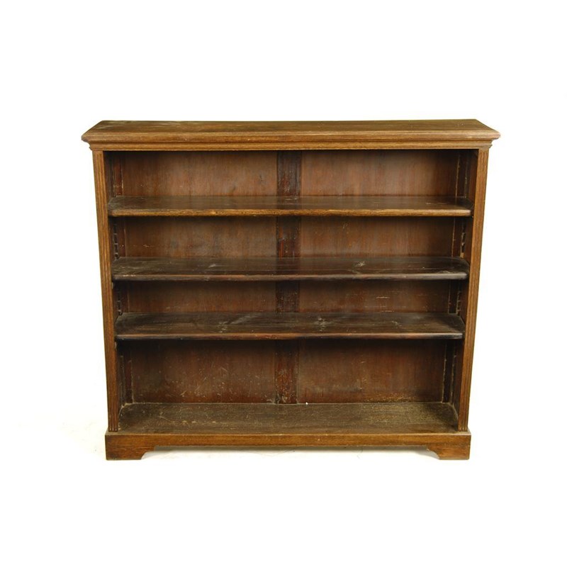 An oak open bookcase, with three adjustable shelves on bracket feet, 42in (106.5cm) h, 47.75in (121cm) w, 11.25in (28.8cm) d.