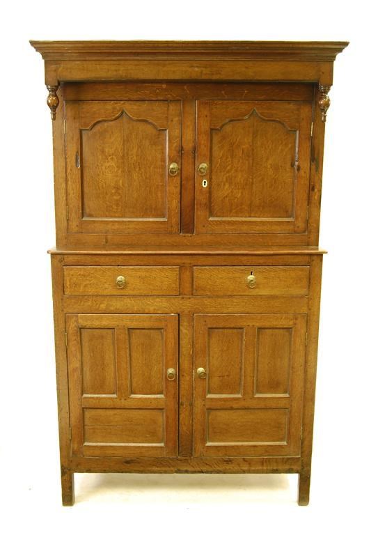 A late George III oak cwpwrdd dueddarn, the canopy with turned pendants above a pair of ogee panelled doors, above two frieze drawers and a pair of triple panelled cupboard doors, fitted later brass ring handles, 71.25in (181cm) h, 43.25in (110cm) w, 20in (51cm) d. Back left foot off but present.