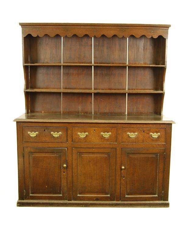 A 19th century oak dresser, with a serpentine canopy frieze and graduated shelves, all previously with hooks, the base with three frieze drawers and a pair of cupboards doors enclosing shelves, 73.75in (187.5cm) h, 63in (160cm) w, 18.75in (47.5cm) d. Metalwork replaced, two mouldings off but present.