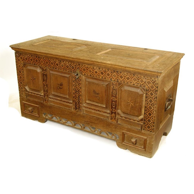 A continental oak and parquetry chest, the hinged twin panel top to a lidded till, the quadruple panel front inlaid birds and star motifs, the base with false drawers and a pierced apron, with side iron carrying handles, 29.75in (75.5cm) h, 58.75in (149cm) w, 23.5in (59.5cm) d. Top water stained.