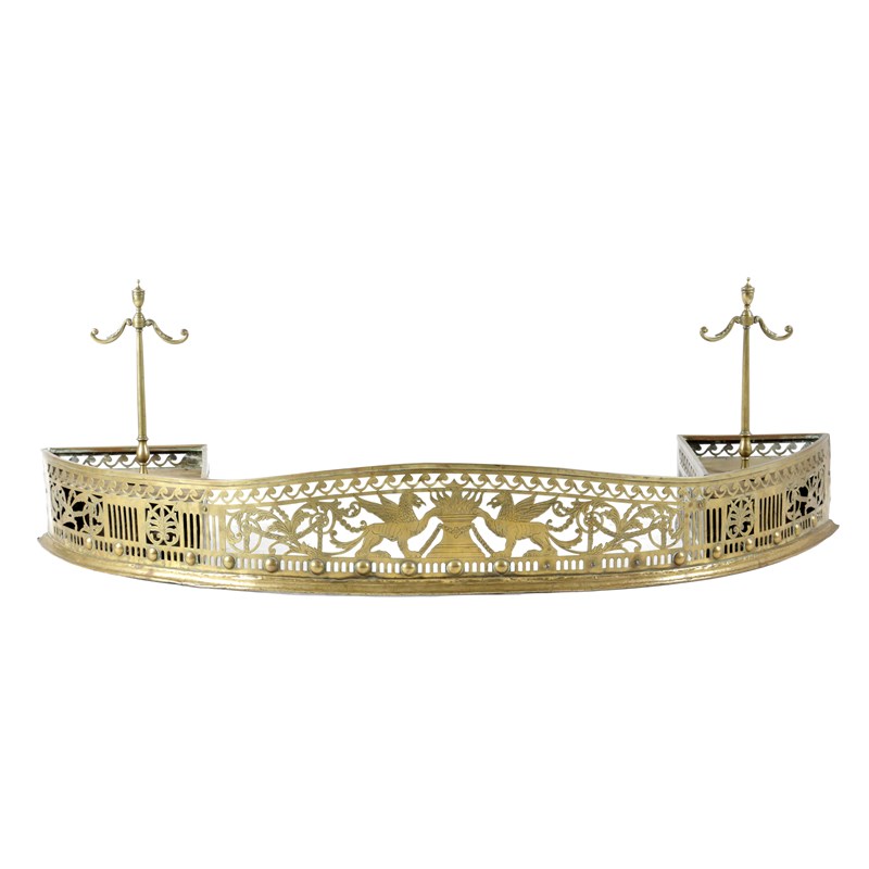 with pierced decoration of a flaming urn flanked by griffins and scrolling foliage and swags beneath a frieze of Vitruvian style scrolls, each end with a branched support for fire irons