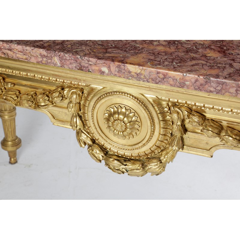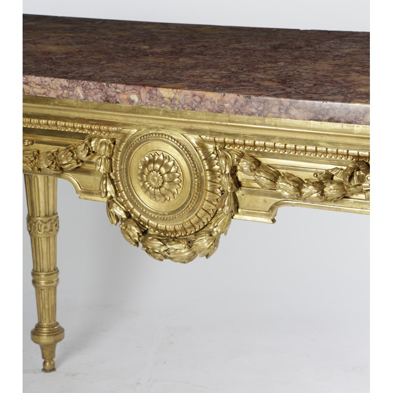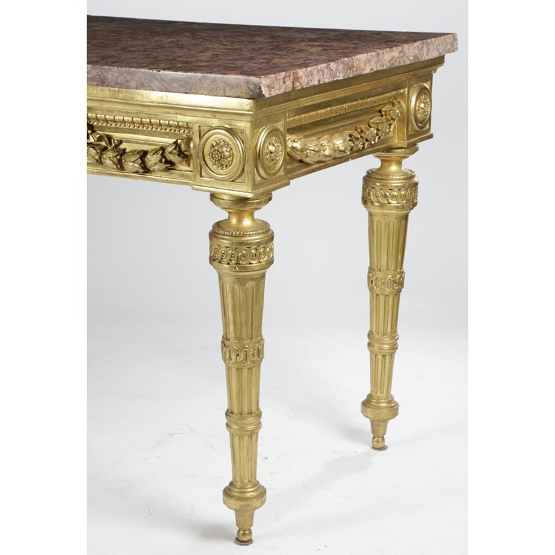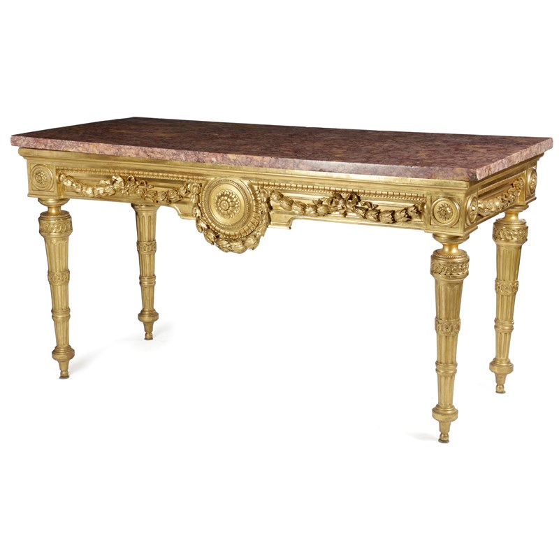 the Spanish brocatelle marble top above a frieze decorated with ribbon tied laurel swags and rosettes on fluted tapering legs inscribed in pencil twice 'M. de Champ 181'