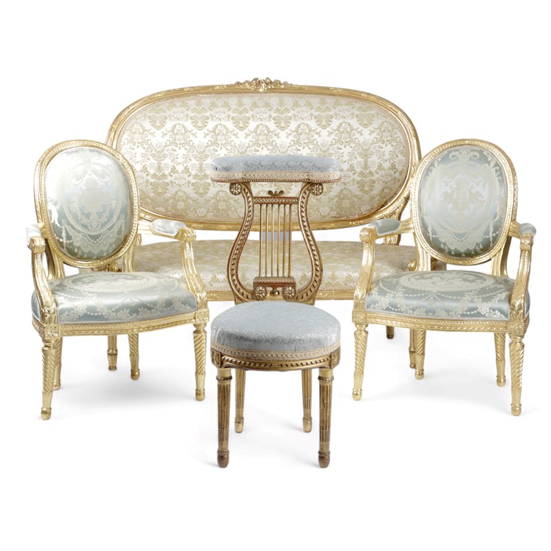 decorated with flowers, scrolls and leaves, together with a French giltwood music chair with a lyre shaped back and a pair of giltwood fauteuil (4)