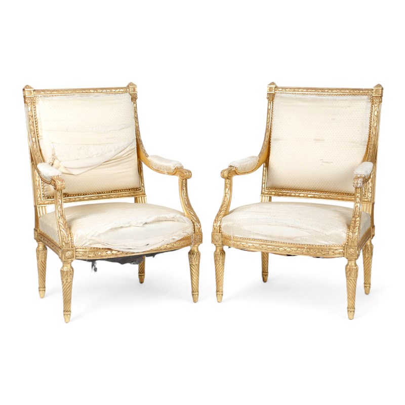 each with a padded back, seat and armrest covered in ivory silk, the frame decorated with laurel leaves, acanthus and paterae (2)