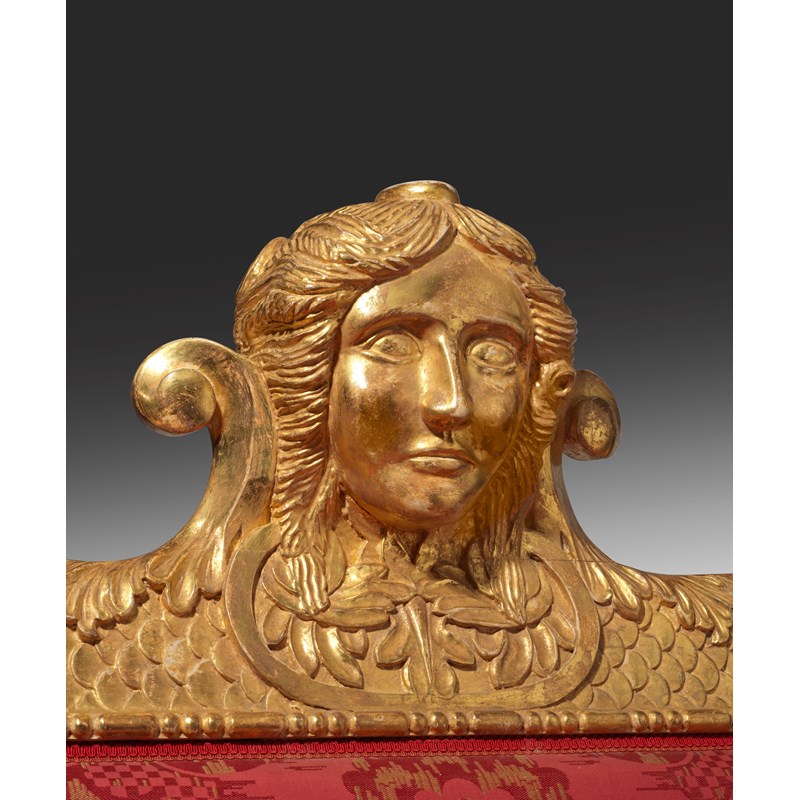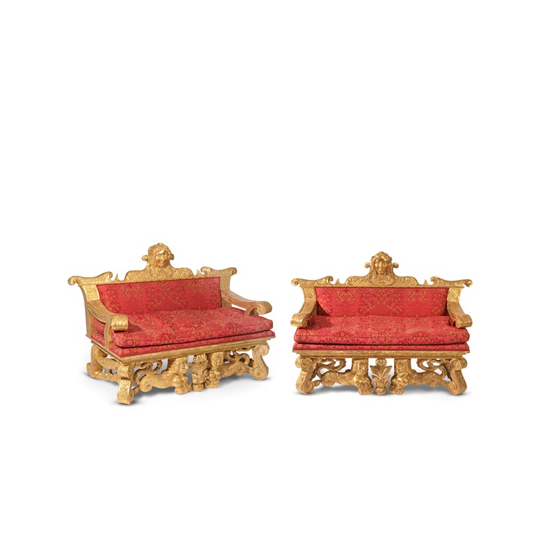 The original set of eight settees, of which this pair is a copy, were designed by William Kent for Richard Child, Viscount Castlemaine, between 1725 and 1730, to go into his newly completed Wanstead House in Essex. The contents of the house were sold in 1822, prior to the house being demolished in 1824. The catalogue described each settee as “an elegant square settee, in superb massive carved and gilt frame, with scrolled elbows, the back stuffed in costly crimson Genoa velvet, and squab to correspond, on scroll legs, the frame ornamented with mermaids [sphinxes], and festoons of flowers”. Six of these eight settees were eventually bought by Catherine Woronzow, wife of the 11th Earl of Pembroke, as part of her refurbishment of Wilton House, Salisbury. The remaining two are now at Rievaulx, Yorkshire.