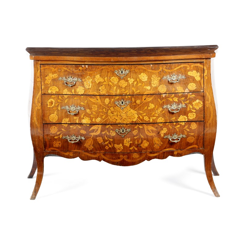 A DUTCH WALNUT AND MARQUETRY BOMBE COMMODE