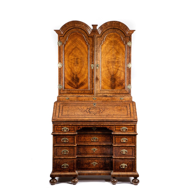 inlaid with banding, the double domed top with a pair of arched doors enclosing pigeonholes, adjustable shelves and an arrangement of fourteen drawers above a pull-out hinged slide inset with a leather writing surface with hinged supports and two inkwells, above a smaller hinged slide and three shallow drawers and a pair of candle slides, the hinged fall revealing a pull-out interior with a leather writing surface, drawers, pigeonholes and inkwell compartments, above an inverted breakfront base with an arrangement of short and long drawers on bun feet