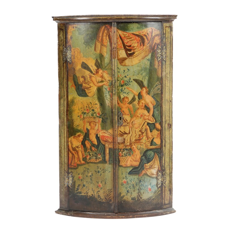 with a pair of doors decorated with classical figures, angels and cherubs revealing a painted interior with three shelves