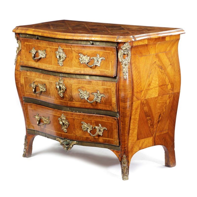 A SWEDISH ROCOCO WALNUT AND KINGWOOD BOMBE COMMODE