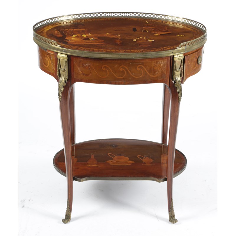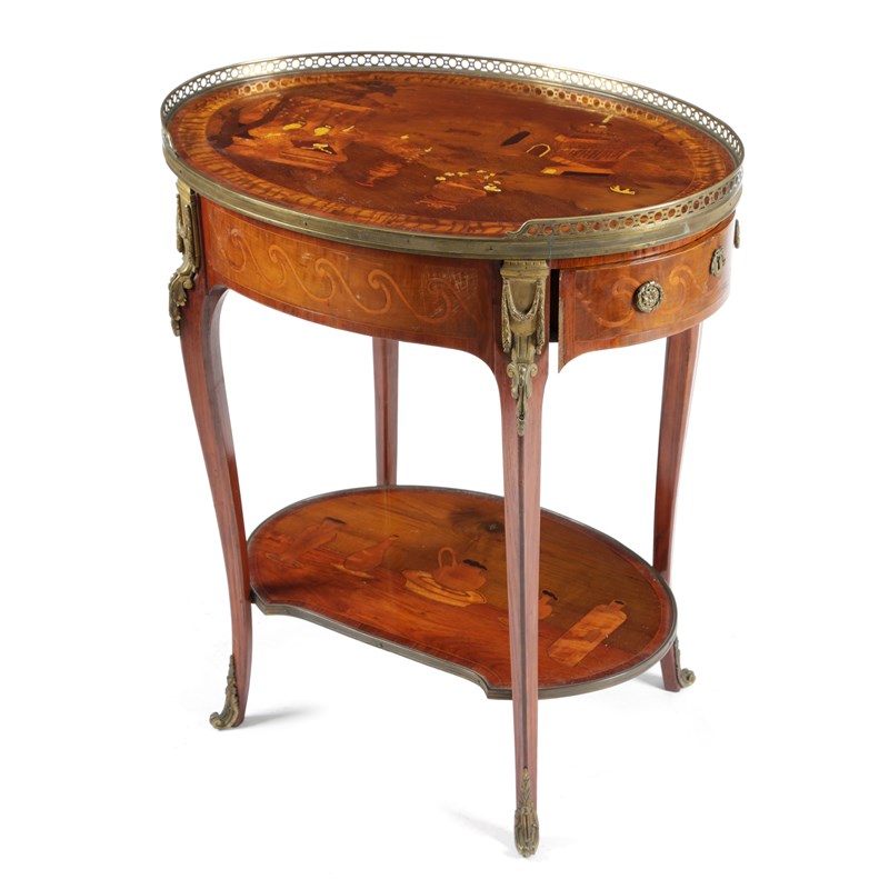 A FRENCH KINGWOOD AND MARQUETRY OVAL TABLE A AMBULANTE