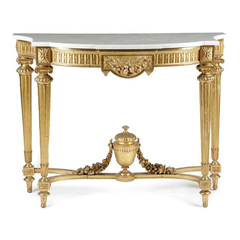 the breakfront white marble top above a fluted frieze centred with a tablet with a ribbon tied swag of flowers on fluted tapering legs united by a stretcher centred with an urn