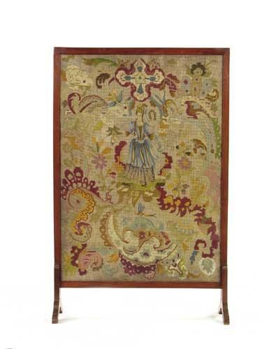 A rectangular needlework panel, depicting a maiden holding a wreath, a dragon to a foliage scroll ground, 33.5 x 24in (85 x 61cm) mounted as a firescreen.