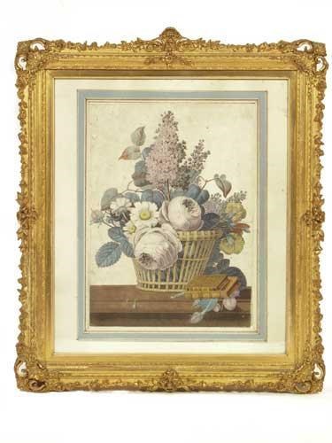 A coloured stipple engraving, still life in a basket with two books on a shelf, borders cut, 13.5 x 9.75in (34 x 25cm).