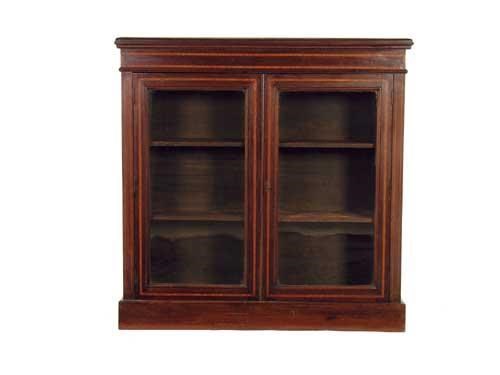 A late Victorian mahogany and satinwood banded bookcase, the pair of glazed panelled doors enclosing adjustable shelves, 42in (107cm) h and w, 11in (28cm) d.