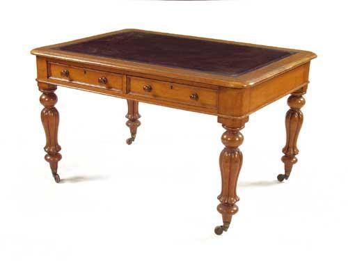 A Victorian oak writing table, the replaced gilt and tooled Morocco leather inset top above two frieze drawers, the inverted baluster melon panelled legs on ceramic castors, 28in (71cm) h, 48in (122cm) w, 34in (86.5cm) d.