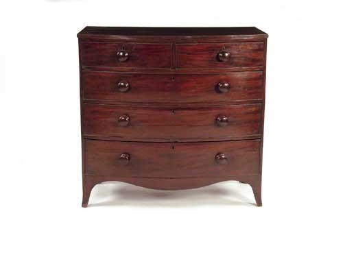 An early 19th century mahogany bowfront chest, the reeded edge top above two short and three long graduated drawers, fitted turned wood handles, on French bracket feet, 40.75in (103.5cm) h, 42.25in (107.3cm) w, 22in (56cm) d.