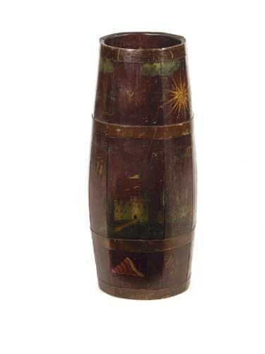 An oak and brass bound stick stand, the painted decoration of a nautical scene, 26in (66cm) h.