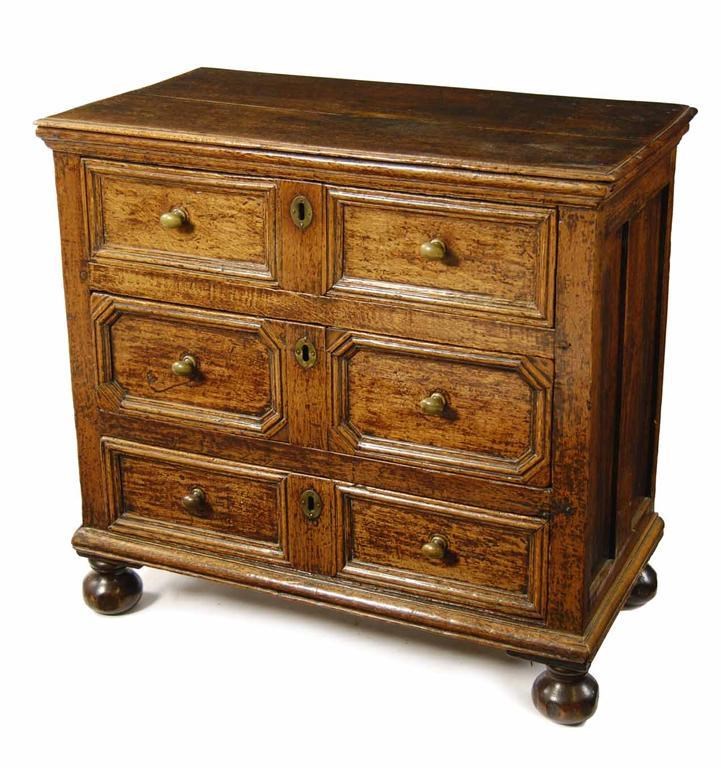 A late 17th century oak chest, the moulded edge top above three long drawers with panelled fronts, on later bun feet, 34.75in (88.2cm) h, 37.75in (95.6cm) w, 20.25in (51.4cm) d. Handles later, old worm to sides and drawer linings.
